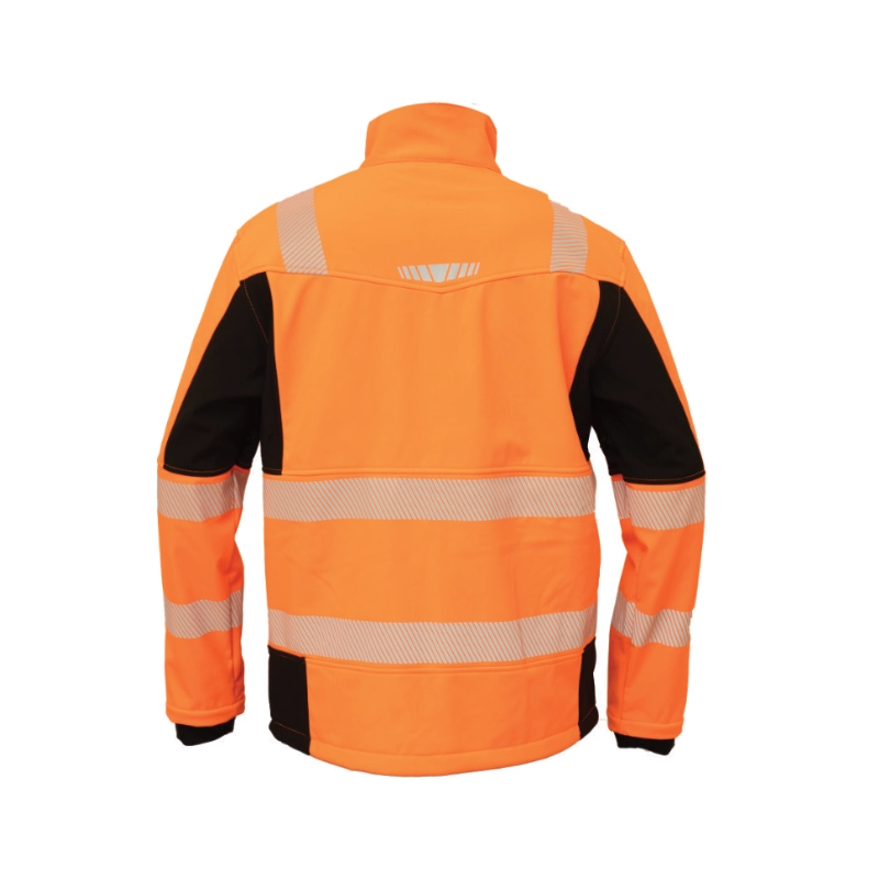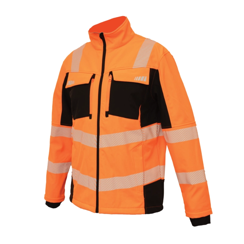 Giacca Softshell Wesafe® Denmark alta visibilità di colore arancione fluorescente con inserti di colore nero e bande riflettenti a losanga (segmentate) per una perfetta visibilità dell’operatore
