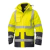 Giaccone Siggi® Multiprotezione ad alta visibilità e anti pioggia di colore giallo fluorescente con inserti blu, realizzato in 98% poliestere laminato PU e 2% fibra di carbonio da 270 gr/m². Dotato di bande riflettenti per garantire una perfetta visibilità dell’operatore. Corpetto con interno in pile e maniche staccabili e cuciture termosaldate per un’impermeabilità totale. Cappuccio rimovibile con coulisse regolabile.