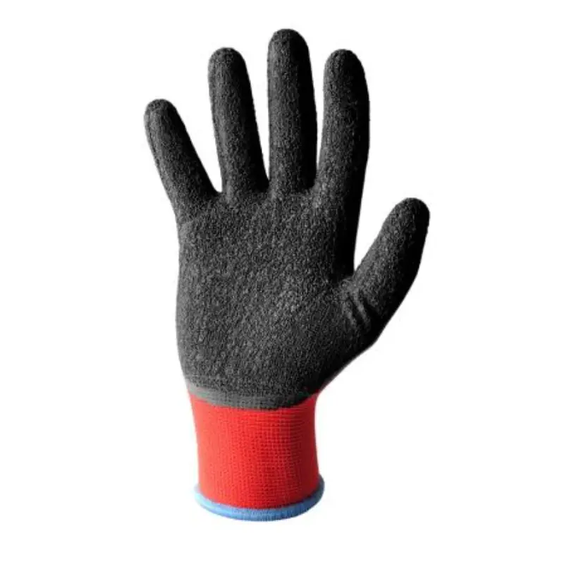 Guanti in filo continuo 100% poliestere rosso calibro 13 spalmato in lattice crinkle di colore nero.