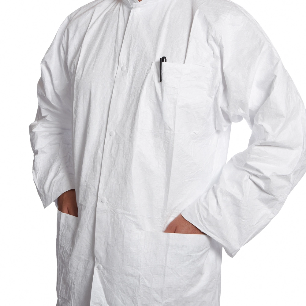 Camice DuPont™ Tyvek® 500 di protezione chimica modello PL30 con cinque bottoni a pressione e tre tasche, colore bianco